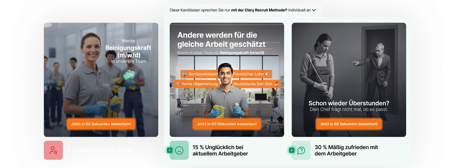 Mit der Clary Recruit Methode sprechen wir nicht nur aktiv Jobsuchende an, sondern auch die vielen wechselbereiten Fachkräfte, die auf klassischen Wegen nie auf Ihre Stellen aufmerksam würden. Durch eine zielgerichtete, motivbasierte Ansprache auf Social Media erreichen wir genau die Menschen, die wirklich zu Ihrem Unternehmen passen – regional, zuverlässig und mit echtem Interesse an einem Jobwechsel.