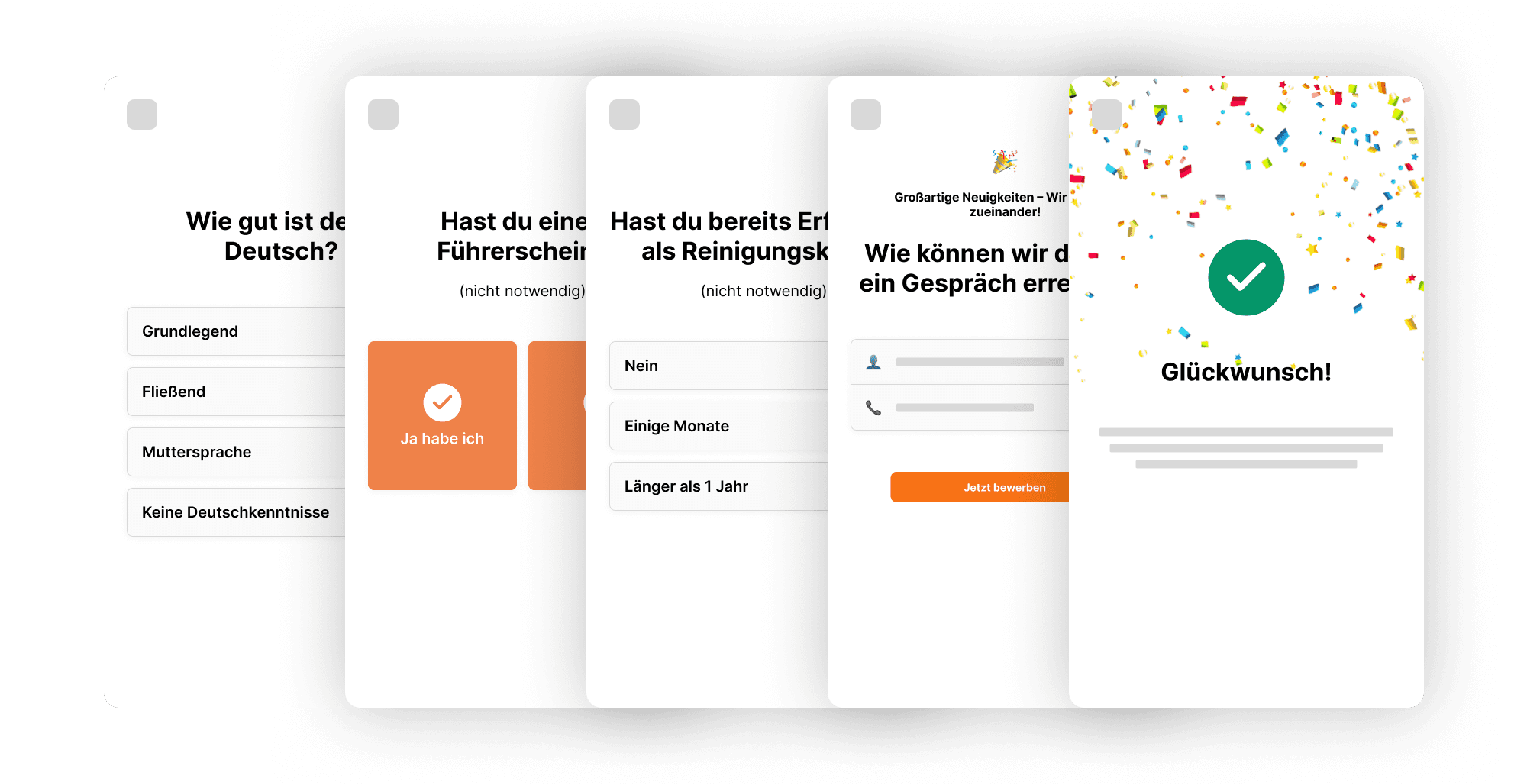 Wir führen Interessenten in wenigen, klaren Schritten durch den Bewerbungsprozess – optimiert für maximale Bewerbungsquote und mit automatischer Vorqualifikation, damit nur passende Kandidaten bei Ihnen landen.