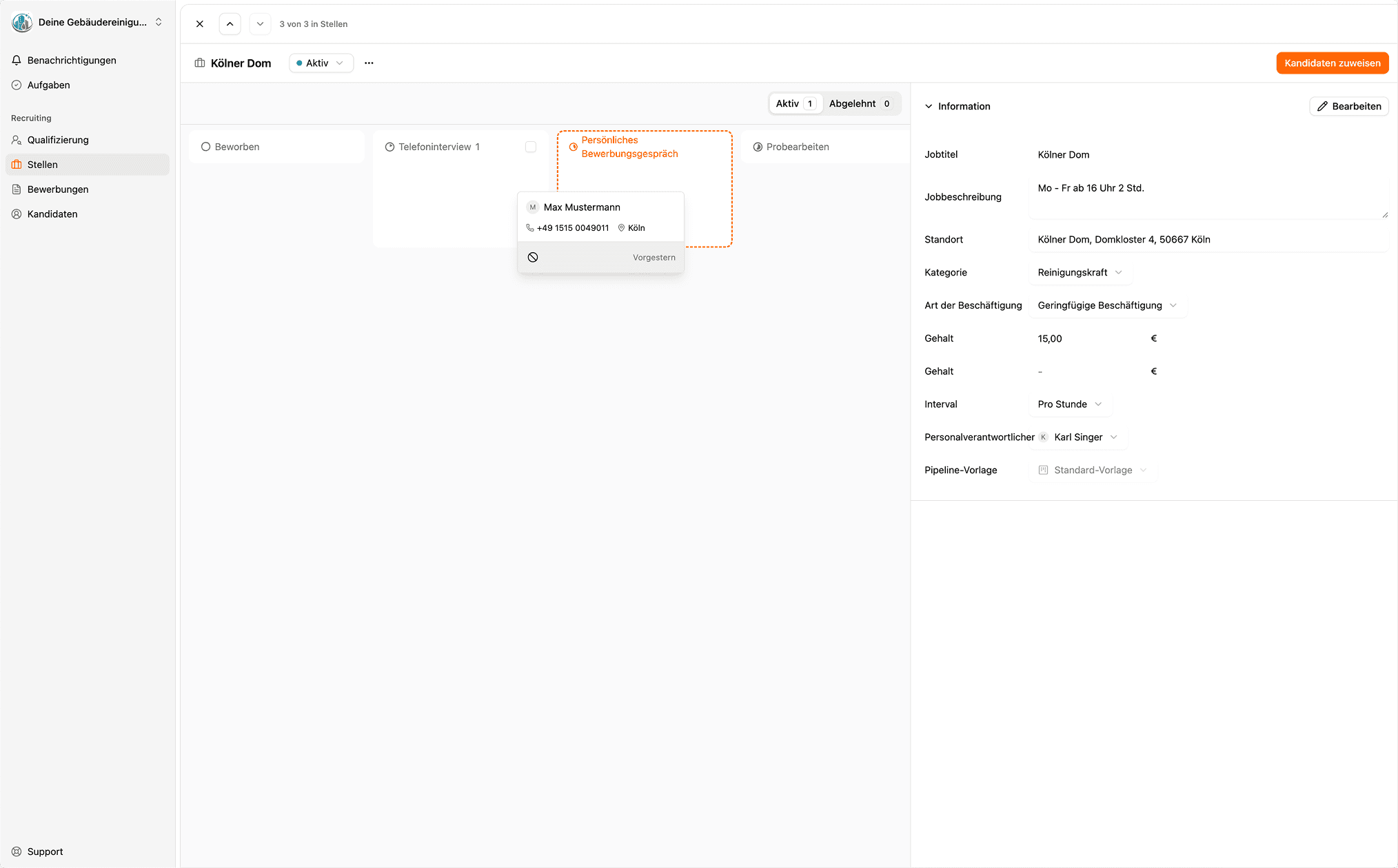 Clary Recruit ist mehr als eine Dienstleistung: Vom ersten Kontakt bis zur digitalen Einstellung läuft alles in einem System – inklusive Bewerber-Pipeline, Arbeitsverträgen und SV-Meldungen direkt im Objekt.